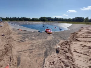 Once the decision to use a geomembrane liner has been made, the intended uses and surrounding environment again come into play when determining the type of liner that is best suited for the project. Whether the liner will be left exposed or covered with soil is one factor to consider as some lining systems are formulated for sun exposure as others are not. The intended use of the pond is another factor, especially if the pond will be used for swimming or wading, as a smooth geomembrane tends to be slippery when wet, and a textured lining system may be better suited for specific practices. If the liner is to be left exposed, and wildlife may be using the pond (especially types with hooves) a scrim-reinforced geomembrane with increased puncture resistance may be key to reducing the risk of liner damage.